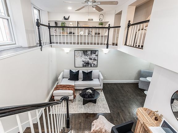 Ceiling fanHardwood floorsThoughtfully designed layoutCharming built-in bookshelf nookSoaring ceilings