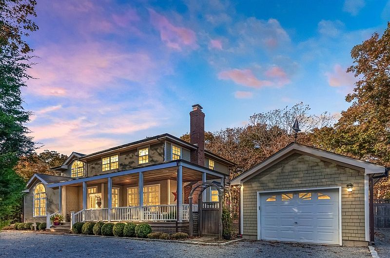 Come home to this immaculate four bedroom, four bath traditional with a welcoming front porch. The main floor has extra tall ceilings and features a living room with wood-burning fireplace, dining area with nook, renovated kitchen with high end appliances, wet bar, den and bathroom. Upstairs is a spacious master with private bath, and three additional bedrooms with a full hall bath and linen closet. For the true wine aficionado, the basement has a stunning wine cellar, as well as an additional multi-purpose room which serves a dual purpose of family room and additional sleeping area with two full Murphy beds. Throughout the home are beautifully crafted custom built-ins providing for organized storage. A sliding glass door leads to the back deck with outdoor bar, dining and 16' x 32' heated pool surround by a landscaped brick patio and irrigation system. Additionally there is a detached one car garage, similarly sized separate storage shed and plenty of reserve land behind the house. Don't miss this turnkey property -- just a short drive to East Hampton village and beaches.