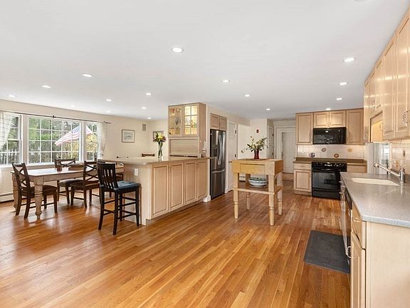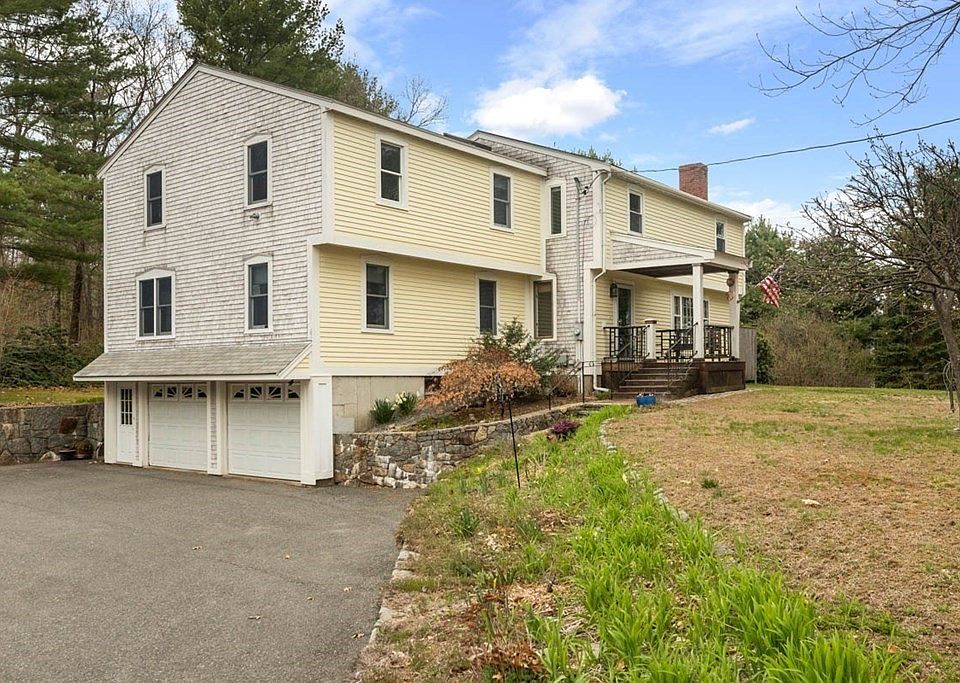 This sun drenched home is located on a private 1 acre plot with multiple extras! Enter through the foyer to the dining room with wood burning fireplace. Enjoy the breakfast bar attached to the kitchen with ample cabinet space including a full wall length counter top. The living room has a wood stove and abuts an office or studio room. Both the kitchen and living room open to the sun room with removable plexiglass panels from the Old Boston Garden Hockey Rink. On the second floor, relax in the oversized master suite with an expansive walk-in closet and en-suite including a double headed shower, double vanity and washer/dryer. There are three additional bedrooms and full guest bath on this floor. Off of the dual deck is the hot tub for relaxing 365 days a year! In the summer, enjoy use of the outdoor shower, various mature fruit trees, and dog kennel with cement pad. A covered wood storage is available for warmth during the winter and summer fires in the yard.