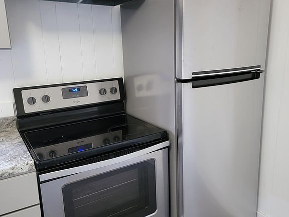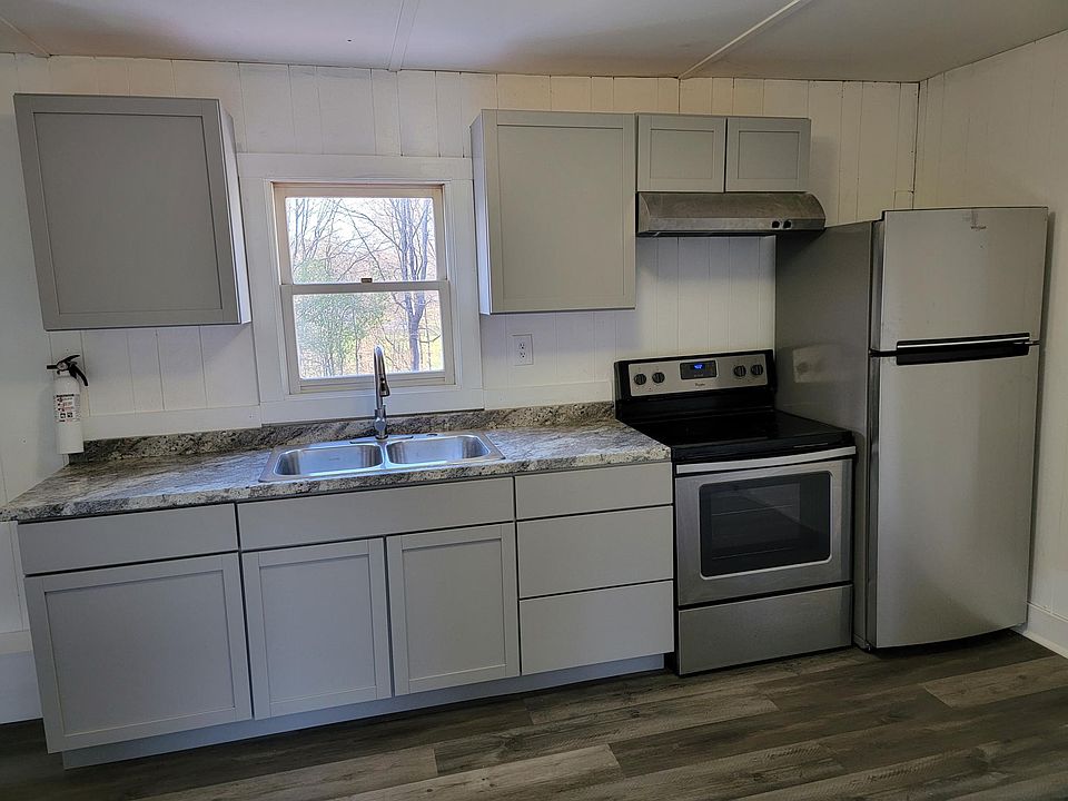 Flat cooking surfacePlenty of natural lightStainless steel stoveStainless steel refrigeratorBarnwood style floorsDouble sinkCounter top