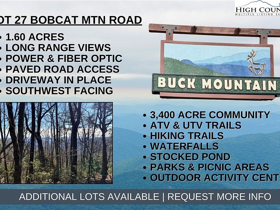 BIG VIEWS – EASY PAVED ROAD ACCESS – SOUTHWEST FACING BUILDING LOT – BREATHTAKING SUNSETS - UNDERGROUND POWER AT ROAD – FIBER OPTIC AVAILABLE - Don’t miss out on this VIEW LOT, conveniently located in the 3,400 acre Buck Mountain community...ONLY GATED ATV COMMUNITY in Wilkes County. Lot 27 is 1.6 acres w/existing driveway in place. Over 108 feet of road frontage. Build your weekend getaway or vacation rental property here. Short-term & long-term rentals allowed. Work remotely w/fiber optic internet! Surround yourself with abundant wildlife and escape the stress of daily life. BUCK MOUNTAIN IS A PRIME LOCATION! Arrive from Winston in under 1 hr, from Charlotte in 1hr 40min, Raleigh in 2hr 45min. Just minutes from High Country activities. Centrally located 35 min from Boone, West Jefferson & Wilkesboro. Close to BLUE RIDGE PKWY, ASU, shopping, dining, golf, wineries, breweries, mtn biking & skiing. BUCK MOUNTAIN HAS HARD TO FIND AMENITIES like ATV Trails, Hiking Trails, Parks, Fishing Pond, Waterfalls, Pavilions, Community Center, Helipad, Outdoor Activity Center w/outdoor stage for live music, community gatherings & so much more! Make lasting memories while spending the day hiking or riding ATVs on the miles of trails. 1,400 SF min to build. NO TINY HOMES. NO MOBILE HOMES. NO SELLER FINANCING.