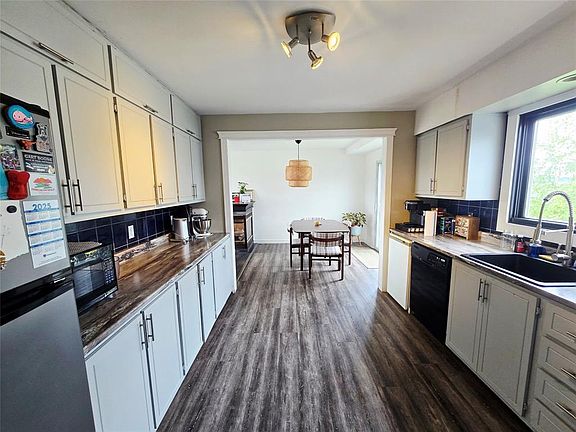 This home is a must-see. The front entrance features a welcoming porch. The bright living room boasts a large window and laminate flooring. The dining room is open to the kitchen and showcases the nice flooring along with sliding patio doors that lead to a large back deck and a 10 x 20 detached garage with a concrete floor, garage door, and convenient man door. The spacious kitchen includes a window above the sink, stylish grey cabinets, ample storage, brand-new countertops, and a modern black granite sink. A half bathroom is also located on the main floor. Upstairs, you’ll find four spacious bedrooms with laminate flooring, closets, and natural light. The primary bedroom includes two large closets, while the freshly painted bathroom features a dark vanity. The basement is partially developed, offering a cozy recreation room with carpet and a drop ceiling, as well as a bonus room with carpet. The laundry area, located in the basement, remains undeveloped, featuring concrete flooring and housing the washer and dryer, with plenty of potential for future upgrades.
