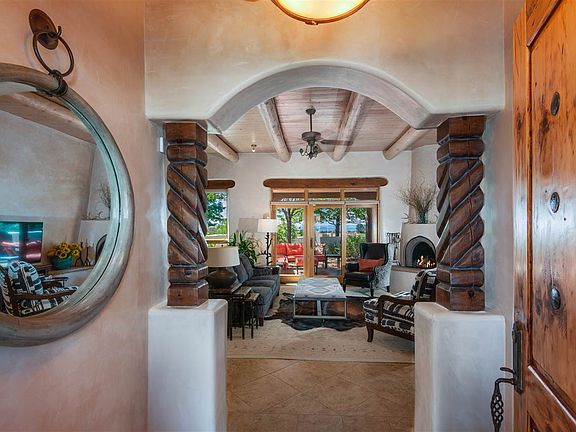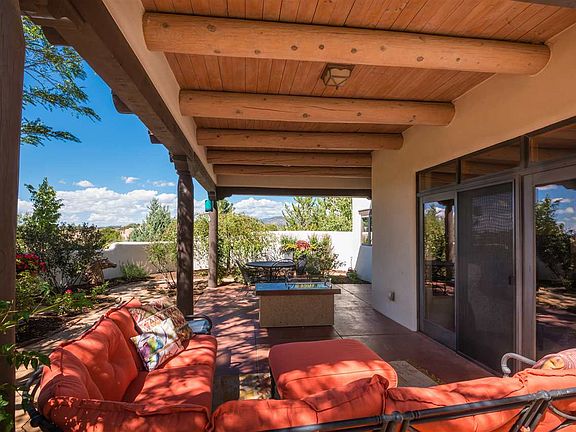 A classic Santa Fe jewel, located on a private and conveniently located lot in Eldorado with gorgeous, mature gardens. Graceful arches, plaster walls, hand-carved pillars, travertine-style floor tiles and tons of natural light this elegant home built by Robert DiJanni. The great room enjoys high ceilings, kiva fireplace and an open bar-style counter to the gourmet kitchen with granite counters, stainless steel appliances and double ovens. The French doors from the great room go to a large portale and walled courtyard surrounded by garden for outdoor living. The modern split floor plan enjoys the master suite and office/studio on one side, 2 guest bedrooms and full bath and powder room on the other side. Also included: full laundry with sink and a 2-car garage. The crowning feature is the beautiful, mature trees and plantings that surround the property creating privacy, while not limiting the mountain views! Home is in turn-key condition!