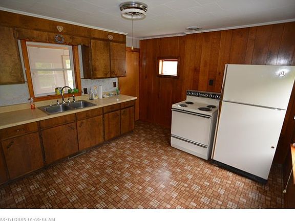 Neat 2 bedroom with one bath cape. Metal roof , sun porch , large 2 bay garage. Nice lot and back yard pleasant lot with frontage on a small brook. Conveniently located just on the edge of town.