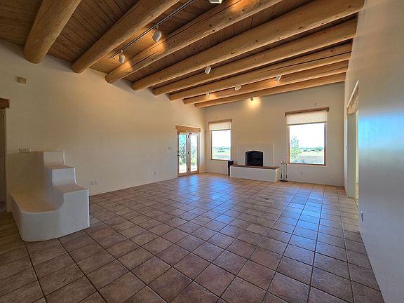 The living room is a focal point with high ceilings, vigas, and a central fireplace, while a second fireplace creates a cozy atmosphere in the primary bedroom. A third fireplace is located in the back courtyard, perfect for outdoor entertaining. The home has been freshly updated with a newly repainted interior, new carpet in the bedrooms, new window coverings, and a new roof. For your comfort a ductless a/c system has been newly installed.