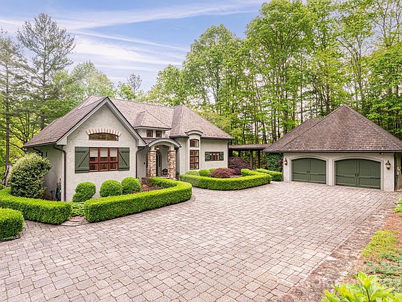 Prepare to be captivated by this truly exceptional residence — a stunning architectural masterpiece set on 1.3 private acres, surrounded by meticulously curated gardens, extensive stonework, and lush landscaping. From the moment you arrive the long, elegant driveway and cobblestone-paved courtyard set the tone for the refined mountain living that awaits. Step inside to soaring cathedral ceilings, solid hickory hardwood floors, and an open-concept layout that seamlessly connects the great room, dining room, and gourmet kitchen. A dramatic floor-to-ceiling stone fireplace with a custom hickory mantle is flanked by built-in architectural shelving, offering warmth and sophistication in equal measure. The chef’s kitchen is a true showpiece, featuring granite countertops, a large breakfast bar, high-end stainless steel appliances, a built-in Miele espresso machine, and a striking floor-to-ceiling stone surround encasing the 36-inch Viking gas range and vent hood. A large walk-in pantry and custom kitchen office with built-in hickory desk and shelving complete this entertainer’s dream. Retreat to the luxurious primary suite, which includes a walk-in closet with built-ins and a spa-inspired bathroom featuring a freestanding soaking tub, dual vanities, and a beautifully tiled walk-in shower. Completing the main level is a powder bath and laundry room with sink and cabinetry. The finished lower level offers a spacious family/recreation room, two guest bedrooms (one ideal as a home office), a full bath, and an expansive heated storage space. A handcrafted timber-framed breezeway connects the home to the oversized, heated two-car garage with a dedicated workshop. Outdoor living is nothing short of magical, with a timber-framed main level patio finished in slate and decorative iron railings, plus a terrace-level patio perfect for quiet moments or entertaining. The breathtaking landscaping includes stone steps, paths, and hardscape details that create a garden sanctuary unlike any other. Located just minutes from Asheville, Hendersonville, Brevard, and the Asheville Regional Airport, this is luxury mountain living at its absolute finest — truly a one-of-a-kind property that must be seen to be fully appreciated.