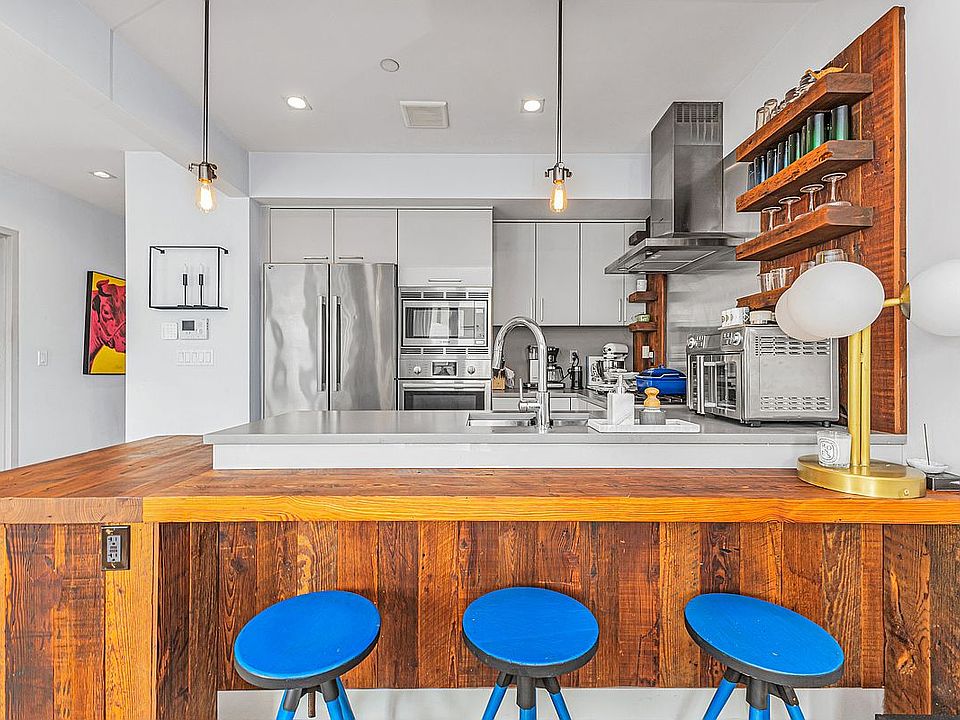 The open living and dining area features floor-to-ceiling windows and hardwood floors throughout. The chef’s kitchen is equipped with Bosch appliances, Caesarstone countertops, reclaimed wood accents, and a breakfast bar—perfect for everyday cooking or entertaining. The two oversized bathrooms include deep soaking tubs, heated floors, and custom vanities. Additional highlights include a walk-in closet, in-unit washer/dryer, Mitsubishi split heating and cooling, and access to a common roof terrace with sweeping skyline views. This unit also comes with private deeded storage room in the basement.