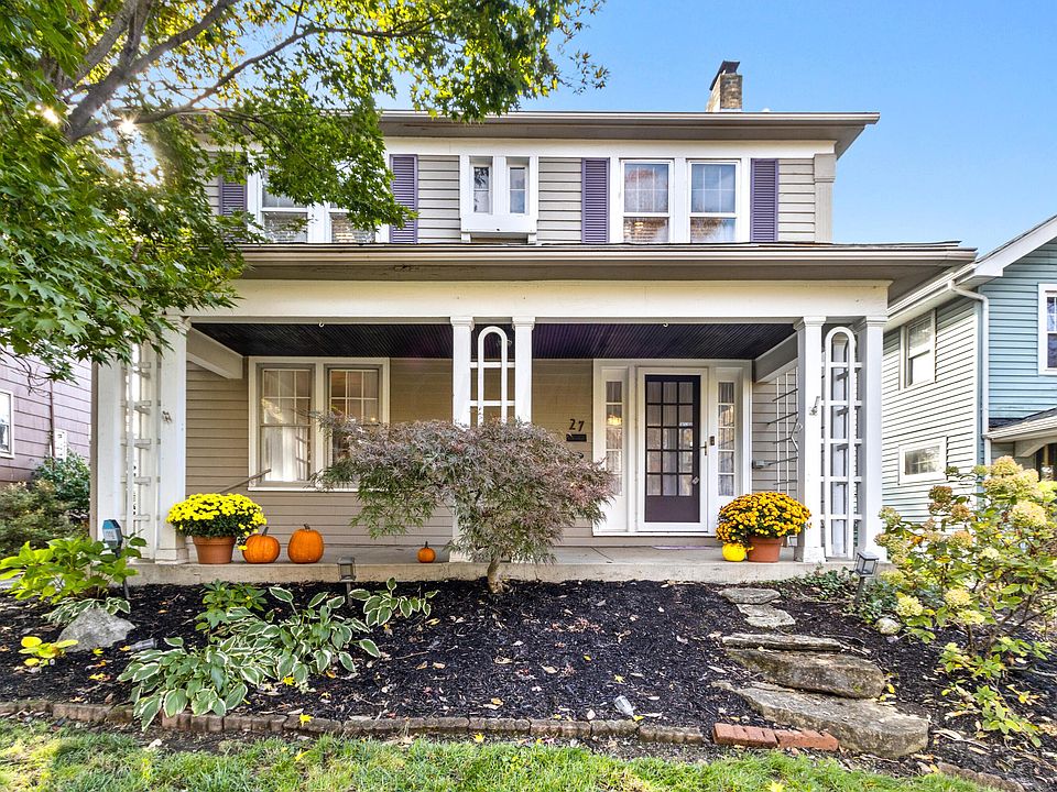 LOCATION, CHARM & UPDATES...it's ALL here! BEAUTIFUL hillside two story featuring full front porch entry to the expansive Living RM. adding light filled interior, gleaming hardwood floors, display fireplace & access to OVERSIZED formal Dining RM. UPDATED & EFFICIENT Kitchen featuring crisp white shaker custom cabinets, granite counters, tile backsplash, SS appliances, single basin sink, BONUS Mud RM, 1st floor laundry & half bath! 3 GOOD size 2nd floor bedrooms & GUT RENOVATED full bath. AWESOME, stamp concrete patio overlooking the private, fully fenced lot & 2 car detached garage w/storage shed! CENTRAL location near Starbucks, Farmers market & ALL that Clintonville has to offer.