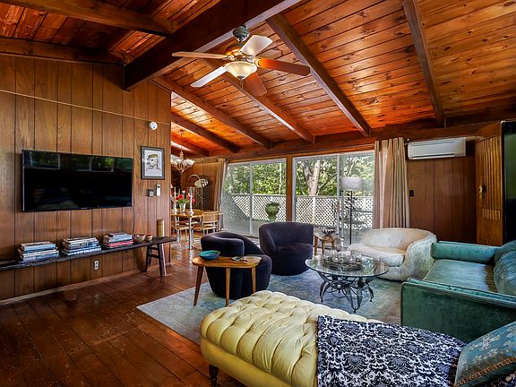 Treetops Cottage is an adorable Acorn Deck style home nestled amongst beautiful trees on a generous 1/2 acre corner lot near Bar Harbor Village. This cozy chalet home was built in 1970 and features warm woods, clerestory windows, an open floor plan, with original mid-century features that ''pop,'' including an aqua Firehood ''cone'' fireplace; ''Creamsicle'' orange bathroom sink and formica, and vaulted ceilings throughout. In true mid-century form, this home offers the best of outdoor-indoor living, augmented with over 2000 sq ft of extensive multi level decking that provide a great deal of privacy, and are situated to thoroughly take advantage of the stunning sunsets, and fantastic birdwatching.