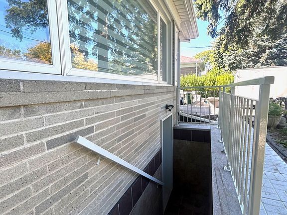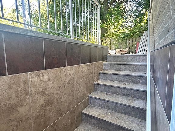 Walk-up separate entranceLarge above-grade windowsModern kitchenAmple cabinetryPorcelain tile flooringStainless steel double-door fridgeAbove-grade window