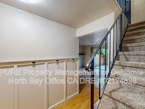 This two-story, 2 bedroom 1.5 bathroom condo is located in the Russian River Pines community in Healdsburg. The main floor features flooring throughout, with carpet only on the stairs that lead to the upper level. The entry hallway includes a half bathroom for convenient access. The kitchen offers generous storage with well-designed drawers, along with a refrigerator, dishwasher, and over-the-range microwave. A built-in dining table is positioned in the corner of the kitchen, providing a designated eating area within the space. The living room includes two built-in wall shelves and sliding glass doors that allow natural light into the room and open to the fenced backyard.