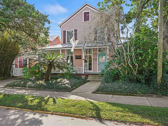 A unique offering within Historic Downtown St. Augustine, 27 Grove Avenue is located on a small, quaint street just minutes from the vibrant city center. Records indicate that this charming Victorian home is among the oldest on the street, likely dating back to its construction in 1894 as part of the Kingsland Addition. Explore the home with the video tour at https://youtu.be/V3bJaNLuPjY. Relax on the wrap-around porch surrounded by lush greenery, or retreat inside to discover two open living areas, a kitchen, full bath, and laundry area on the ground level. Traditional elements blend with updates, while allowing a vision for more modern personalized touches. Ascend the traditional staircase to find two spacious bedrooms and two baths with generous closets and storage, which can be a rare find in historic homes. The carport was seamlessly added to hold two cars, and includes a beautiful, artistic touch commissioned by the owner. With zoning allowing nightly rentals, you have the opportunity to share the home with others or savor its charm for yourself. Enjoy the convenience of being minutes away from restaurants, shops, and St. Augustine's rich history, all without the hassle of parking or take a short drive to put your toes in the sand of the beautiful area beaches. This is your chance to be intertwined with the history and story of St. Augustine.