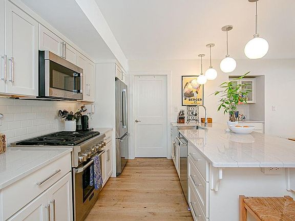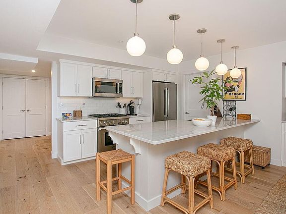 Elegant first floor condo with convenient, sophisticated amenities located in the heart of Newport's Historic Hill! This newer construction condo has a foyer entry offering the perfect “welcome home” into this single level condo, with an open concept floor plan with wide plank hardwood flooring throughout. The kitchen is light and bright with custom finishes, including white cabinetry, quartz countertops, stainless steel appliances with gas range, apron sink and pendant lighting. The living room has a cozy gas fireplace + custom mantle. The luxurious primary bedroom retreat has a large walk-in closet with a California Closet storage system, an ensuite bathroom with double vanity, large soaking tub and separate shower. The second bedroom also has an ensuite bathroom with shower, and custom shelving for storage. There is a powder room for guests tucked just off the foyer and laundry room. The elevator makes for easy access to the underground parking space. The second parking space is assigned, and conveniently located street side on High Street. With central AC, efficient gas heating system, basement storage and a managed building…you’ll have easy living on High Street! Walkable to Bellevue, Thames Street + Broadway…you can’t beat this location!
