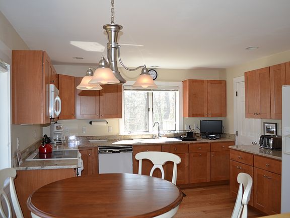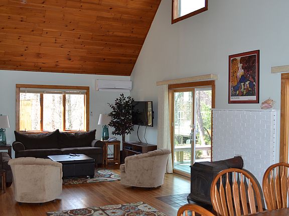 A setting of serenity and tranquility...set back from the street on 3/4 of an acre of privacy. Two bedrooms, eat in kitchen, great room with 2/1/2 story vaulted ceiling with sky lights. Fully renovated in 2017 with all new 2nd floor master bedroom and bath (shower and claw foot tub); all new insulation, roof and some windows; full roof mounted solar array. House has two large decks. New privacy fencing. and large skylights. Custom kitchen cabinets, granite counter tops, and hardwood flooring in kitchen and throughout. First floor bedroom with private deck . Efficient heat and AC pumps through the house!