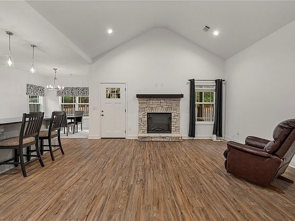 Step inside to an open-concept floor plan featuring luxury vinyl plank flooring in the main living areas and a stunning stacked stone fireplace that creates a cozy focal point in the family room. The kitchen boasts beautiful custom cabinetry, featuring crisp white uppers paired with a subtle pop of color on the lower cabinets for a stylish contrast. The oversized island offers plenty of space for extra seating and seamlessly overlooks the great room, creating an open and inviting layout. The eat-in kitchen is spacious enough to double as a dining room, providing ample room for a large family table and gatherings.