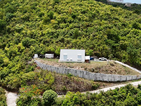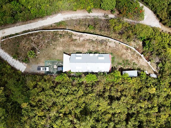 This enchanting two-story A-frame house, set on a 1.19-acre lot, offers sweeping views of the stunning Caribbean waters and vibrant sunsets over the west end. The bright, open floor plan features a spacious living area enhanced by an exposed beam ceiling and charming rock accent walls. Beyond the living area, you will find a cozy bedroom with an ensuite bath and private patio terrace. The upstairs bedrooms feature balconies that offer a tranquil escape, and the shared bathroom has been thoughtfully remodeled with dual sinks, updated fixtures, and a large custom-tiled shower. Plenty of storage is available, including an attic accessible via a pull-down ladder at the top of the stairs, a matching A-frame shed, and a large storage container. This idyllic home is equipped with a reinforced roof, a four-step whole-house water filtration system, and a robust 265 foot concrete retaining wall. This property is a perfect blend of charm, comfort, and convenience, waiting to welcome you home.