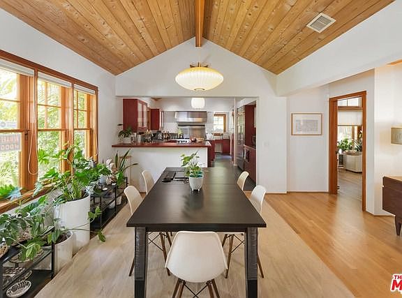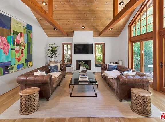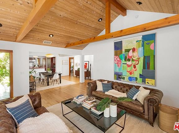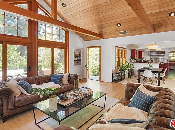 Fully furnished lease. A serene hideaway that will calm your senses awaits you in sought after Rustic Canyon. Soaring ceilings and wood & stone flooring enhance the wonderful feeling of nature. A Japanese soaking tub & multiple closets enhance the master suite and a loft plus walk in closet compliment the en-suite guest room. A third bedroom has direct access to the outdoors. A breakfast bar looks unto the stainless counter tops & commercial stove. A bonus room with separate entrance and 1/2 bath plus a charming guest house with a full bath, sink & refrigerator offers a range of life style choices. The private pool & spa are made for sun bathing. An oversized garage + off street parking for 5 additional cars complete this unique offering. Main house approximately 2100 sq ft; unit below main house with separate entry good for rec room, teenage bedroom, office, music, etc, approximately 400 sq ft; separate guest house approximately 400 sq ft.