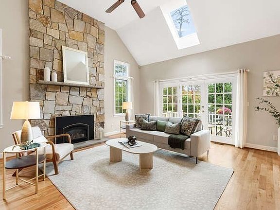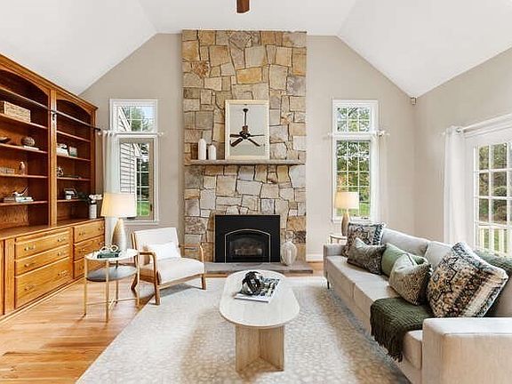 Stone masonry fireplaceCape style homeCathedral ceilinged family roomScreened in porchFirst floor primary suiteFull sized basementCustom book shelves