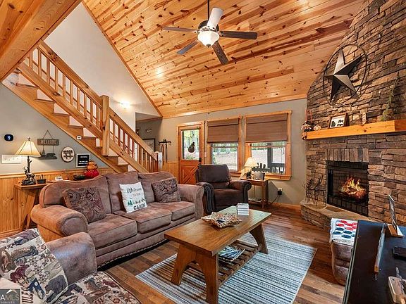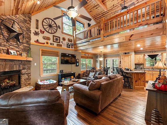 Welcome to your dream mountain retreat in the highly sought-after Coosawattee River Resort! This beautifully crafted 3 bed, 3.5 bath cabin with a loft sits on 1.26 acres and is being sold fully furnished and move-in ready-perfect for full-time living, a part-time getaway, or as an active short-term rental with impressive 2024 rental income of $42,451. Thoughtfully designed with a bedroom and full bath on each level, the layout offers ideal comfort and privacy for families and guests. The main level features a spacious master suite, cozy living room with big open ceilings and a stacked stone fireplace, and a chef's kitchen complete with stainless steel appliances, wood cabinetry, and an island. Upstairs, enjoy a fun loft with teepee beds, a bedroom, and full bath, while the finished basement offers a game room, two more bedrooms, another full bath, and a garage. Loaded with custom upgrades and quality finishes throughout, this cabin also shines outdoors: unwind in the hot tub, relax on the screened-in porch, gather around the fire pit, or enjoy the expansive wrap-around deck, flat yard, and concrete driveway-a rare find in the mountains that offers easy access and ample parking. Plus, with fiber internet, remote work and streaming are seamless. All of this is nestled in a gated resort community offering pools, river access, and a lake-just minutes from Ellijay's restaurants, orchards, and wineries. With strong rental history, unbeatable charm, and a prime location, this is a rare opportunity you don't want to miss!