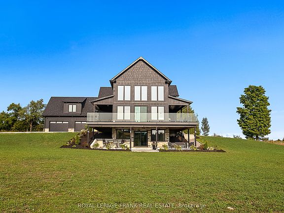 Luxury, privacy & breathtaking views! This 2023-built custom estate sits on 8.93 acres of rolling hills, creeks, and mature trees. With a total of 6,683 square feet of finished living space (per floor plans), this home is packed with high-end features. The great room stuns with 18-ft ceilings, a floor-to-ceiling 84" fireplace, and massive windows offering panoramic elevated views in all directions. The chefs kitchen boasts a 10" island, quartz counters, pro-grade appliances, a walk-in pantry with beverage fridge, and custom plywood cabinetry. To accommodate guests or multi-generational living, the home includes a private in-law suite/loft apartment with a full kitchen, 4-pc bath, separate laundry, and private deck with glass railings. The primary suite is pure luxury with a fireplace, 5-pc spa ensuite with heated floors, walk-in closet with built ins, and private patio access. Upstairs, 3 spacious bedrooms all feature walk-in closets, including one with a private ensuite and the other 2 with a Jack-and-Jill bath. The walkout basement adds even more space, featuring a gym, large rec room, 5th bedroom, full bath, cold cellar, and a private security/panic room. Additional highlights include 9-foot ceilings on the main and lower levels, engineered hardwood & pot lights throughout, a huge wrap-around composite deck with glass railings, fully fenced property with two fire pits & armour stone gardens, 3.5-car insulated garage w/ side-mount openers, & whole-home security system with 5 cameras. All of this is conveniently located just 12 minutes to Costco, 10 minutes to Hwy 407, and 1 hour to Pearson Airport. A rare blend of luxury, privacy & convenience - don't miss it!