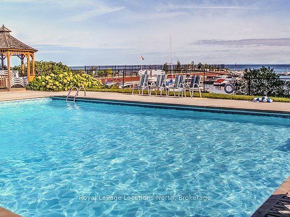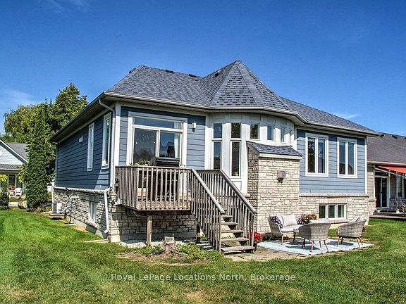 This four-bedroom, three-bathroom executive raised bungalow in the Blue Shores community of Collingwood is situated steps from majestic Georgian Bay. Enjoy water views from both the front and back of this meticulously renovated home that includes all new light fixtures, extra-high baseboard trim, new windows and quality white paint throughout. Picture yourself in the nautically-inspired kitchen featuring a Bertazzoni gas stove, Blomberg fridge, and North Sea navy base cabinets and island capped with gleaming white quartz countertops. The main floor features wide-plank hickory wood floors, with vaulted ceilings and a gas fireplace in the living room, a four-piece main bathroom as well as two bedrooms. The large primary suite includes a custom walk-in closet, and four-piece bathroom with large soaker tub and wide walk-in shower. The lower level features extra-high ceilings, large windows and driftwood-like laminate flooring, a spacious recreation room, two good-sized bedrooms, a three-piece bathroom as well as a workshop and tons of storage. Rounding out the home is a two-car garage and bonus loft. The well-managed development offers tennis/pickleball courts, a marina, kids playground, indoor and outdoor swimming pools, a hot tub, billiards room, gym, and impressive party room with kitchen. The $484.50 monthly common fee includes all Clubhouse and related amenities, as well as total lawn care and snow clearing services. Make this move-in ready home part of your next chapter in this friendly adult waterside community.