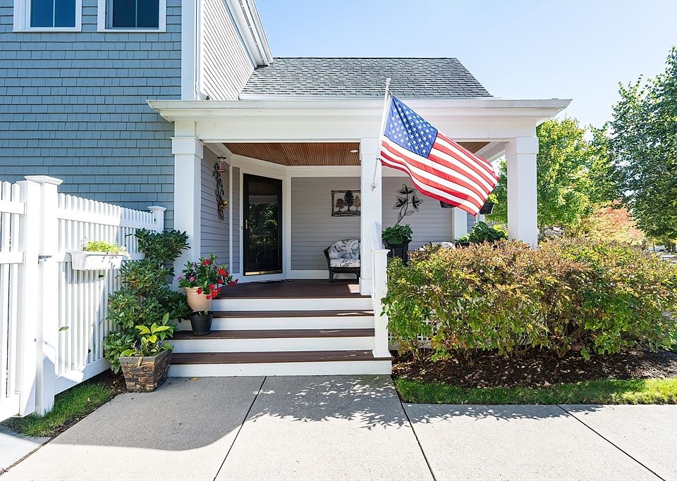 Presenting an "Expanded Bailey" at Red Mill Village. A RARE END HOME with an outstanding floor plan design that checks all the boxes! A very inviting entrance allows restful sunny afternoons on the Farmer’s Porch. Enter into a two story foyer with a beautiful staircase. To the right, behind French doors, is a perfect Den or Home Office overlooking green space. To the left is a beautiful Kitchen featuring seating for 2 at the island bar. Natural gas cooking, granite c-tops, ss appliances and a Dining room to entertain in. The cathedral ceiling Living Room features a gas fireplace & a wall of windows overlooking the private, fenced in Yard and Patio. Two Primary Bedrooms each with an en-suite Bath one on the 1st floor & one on the 2nd floor. Laundry room is on the 1st floor. An oversized Loft that is quiet & private completes the 2,415 sq ft of living space. Tons of storage in lower level & a 2 or 3 car garage! Min to I495. Enjoy maintenance free lifestyle! Pet friendly. Age 50+ is OK
