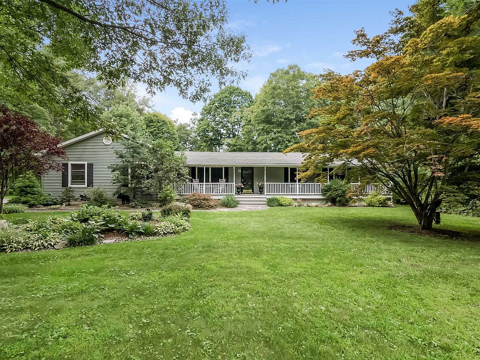 Impeccable custom sprawling front porch Ranch. Open floor plan for easy entertaining. Beautiful hardwood floors. Oak kitchen cabinets, stainless appliances. Wainscoating and crown molding throughout. Freshly painted with neutral shades. Huge master bedroom and bath with walk-in closet. Two additional bedrooms, one with private bath. Also, laundry and half bath on main level. 700 sq. ft. recreation room in finished cozy lower level with pellet stove and workshop and plenty of storage. Outside access through bilco doors. Two car garage with inside access as well. This very custom home sits on 1.85 level acres of private matured landscaping at the end of a cul-de-sac. Many updates and has been maintained inside and out beautifully. Pride of ownership on this property at its best. Just minutes to village, trains, and major routes for commuting as well as convenience to all shopping. You won't be disappointed.