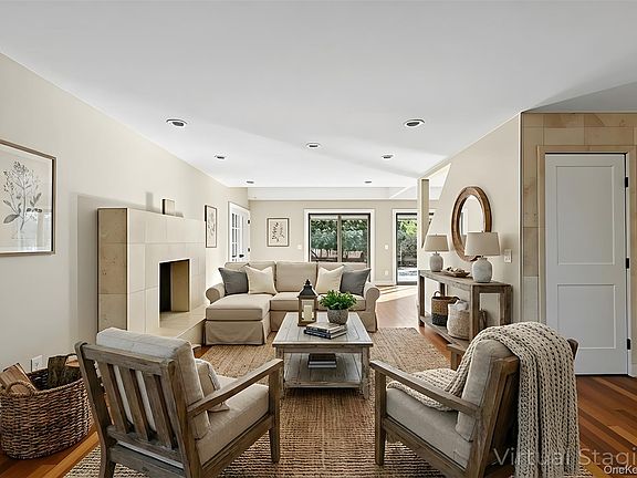 skylights, and elegant spiral wood staircases. The chef’s kitchen opens seamlessly to a spacious living room with a travertine fireplace, perfect for