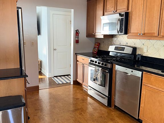 Updated kitchen with granite countertops and modern stainless steel appliances