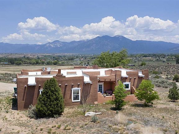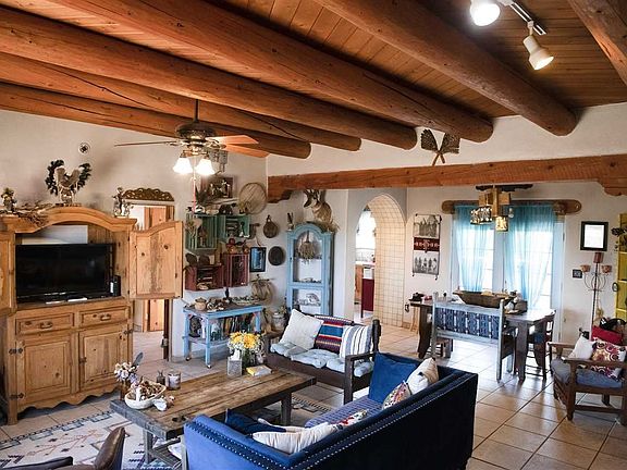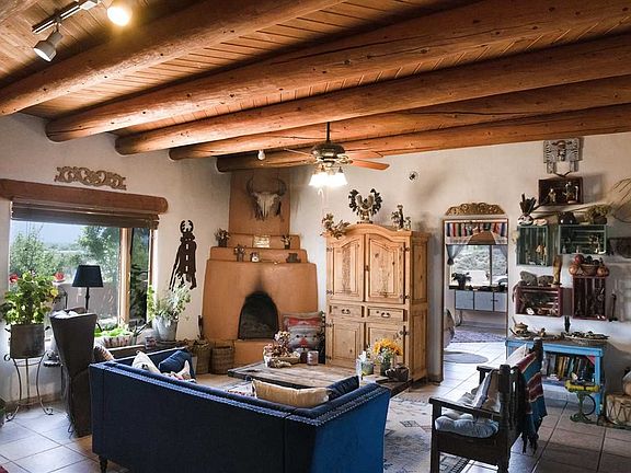 IMMEDIATE INCOME OPPORTUNITY...This Custom 3 bed 3 bath Southwestern home is being sold with a 3-year lease in place. SPACIOUS floor plan with LARGE rooms, particularly the grand master bedroom containing an elegant tiled bathroom, second Kiva fireplace, and direct access to the back patio. The outdoor perimeter offers sweeping 360 views beyond the yards thriving perennial & annual trees with ample space for a garden, zero-scape, or entertainment area. Plenty of custom features throughout the interior of the home -- Vigas, Nichos, Coved Ceilings, Herringbone T&G, Venetian Stucco, Spiral Beams, and special Hand-Made Doors created by Edward Duran Sr. and Mark Romero. Very respectful & responsible tenant, evident upon arrival at the residence. The large one car garage is currently being used as a studio/storage in well-kept condition. Plenty plenty of potential with this residence, come see for yourself...