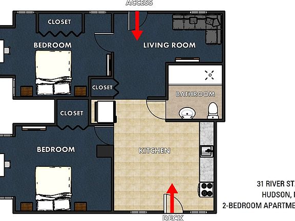 Wonderful 1st floor, large 2 BR apartment on River St, Hudson. This unit is a 2 minute walk to downtown Hudson shops, restaurants, bank, ice cream and more; and close to all major routes. It offers a large eat-in kitchen, fully applianced with 20 cu in fridge, gas stove, and dishwasher. 2 large bedrooms feature oversize closets and plenty of windows. Huge living room, 2 off-street parking spaces, and laundry room next door! FHW heat by gas.