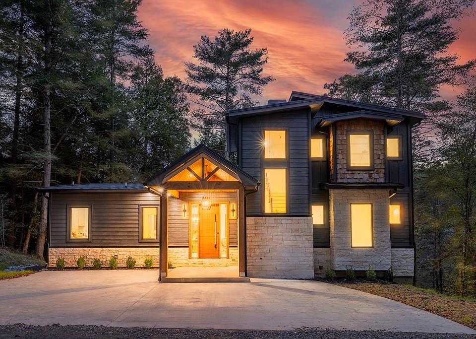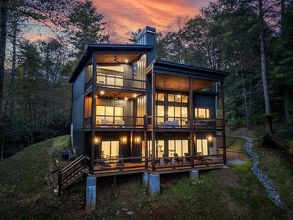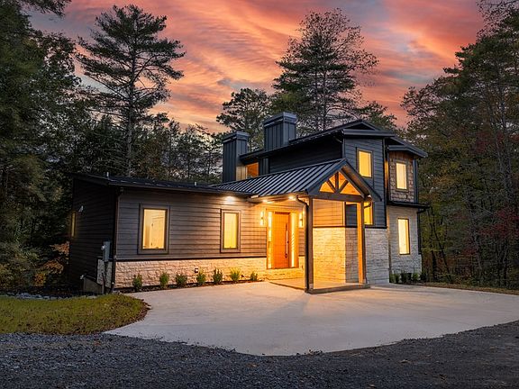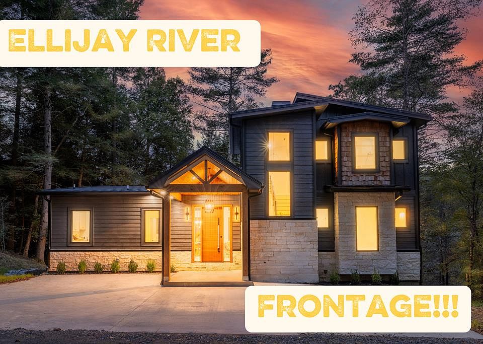Mountain modern meets contemporary luxury on the banks of the Ellijay River. Set within Goose Island Hideaway, an intimate, gated community, this brand-new fully furnished residence is a masterpiece of luxury & modern design, set on a secluded .9-acre lot boasting over 150 ft of private river frontage. With trout fishing just steps off the back & the soothing sounds of the rushing river surrounding the home, you can't help but relax. As you step through the striking solid Mahogany front door, you'll immediately appreciate the meticulous attention to detail throughout the home. The main level features an open concept floor plan, highlighting stunning exposed wooden beams, Taj Mahal natural quartzite countertops & a genuine Texas Limestone fireplace & kitchen backsplash. Custom wood cabinetry and European White Oak flooring flow seamlessly throughout the residence, exuding sophistication & warmth. The main living area extends to expansive deck space, perfect for entertaining, with additional dining & lounge areas, as well as a cozy fireplace — all overlooking the picturesque river. The home offers two luxurious primary suites, one on the main level & another upstairs. Both suites feature opulent soaking tubs, double custom vanities & custom tile showers. The upstairs primary suite further indulges with a private balcony, perfect for enjoying the serene views & sounds. The terrace level presents two additional guest rooms, two well-appointed bathrooms & extra living space, promising comfort & privacy for visitors. The terrace deck provides even more entertaining space and includes a staircase for easy access to the river, making it an ideal spot for relaxation. Offered fully furnished with high-end, professionally designed interiors, this exquisite home is move-in ready - all you need to bring is your fishing pole. Experience the best of luxury mountain living in this remarkable home, where every detail has been curated for your comfort and enjoyment.