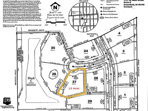 Welcome to Rockfield Estates, a new custom home community located between Greenfield Indiana and New Palestine Indiana within Southern Hancock Schools. This neighborhood provides direct access to the Pennsy Trail, a paved and maintained walking and biking trail that allows convenient outdoor recreation. Rockfield Estates offers 1.5 to 2 acre lots with options that include pond views and tree-lined settings. The community features natural gas, streetlights and sidewalks. Soil testing has been completed, and well and septic are required. Lot 27 includes 1.5 acres with a private rear setting on a pond. Located in a cul-de-sac. Community guidelines allow fences and 2400 square foot pole barns. Minimum home size is 2400 square feet for a one story and 2600 square feet for a two story, with at least 1600 square feet required on the main level. Vinyl siding is not permitted. Approved builders are required. Joyner Homes is currently the approved builder for Rockfield Estates and can build custom plans or offer their available designs. Other builders may be considered with developer approval when submitted at the time of the lot offer. Additional lots are available and reservations may be made while inventory remains available.