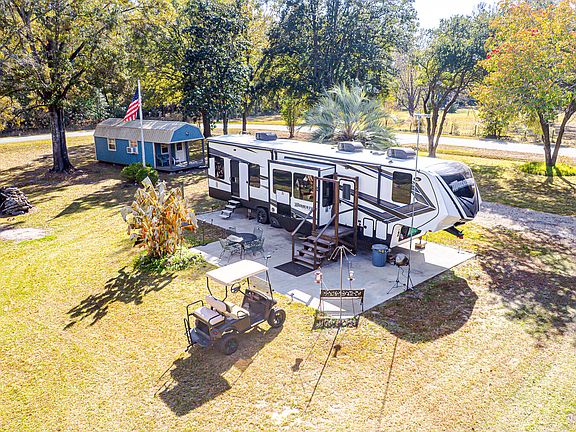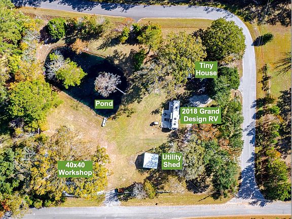 Discover the perfect blend of peaceful country living and turnkey convenience... Situated on 2 acres of beautifully maintained land, this unique property provides everything you need to settle in comfortably while enjoying the freedom to travel or simplify your lifestyle - INCLUDING a 44ft RV already set up for immediate use!The grounds feature a serene fishing pond and THREE well-equipped outbuildings. A 40x40 workshop with full electricity is ideal for projects, storage, or hobby use. The 20x20 utility shed includes electricity and water and is already outfitted with a washer/dryer, storage shelving, gym equipment, and an extra refrigerator. A charming 12x32 wooden tiny house (with electricity, insulated walls, window AC, and water line)offers excellent potential for living spacewith only minor finishing. A major highlight of this property is the 44-foot 2018 Grand Design M-Class RV, fully hooked up and ready for immediate enjoyment. This luxury RV offers sleeping space for 8+, an 18-foot toy hauler compartment, three slide-outs, and a rear ramp that converts into a patio expanding your outdoor living area. With three awnings and three TVs (including one outdoors), it's the ultimate setup for relaxing weekends, hosting friends, or tailgating in style. To make country living even easier, the sale includes a golf cart, a 2012 Kawasaki dirt bike, riding lawn mower, miscellaneous lawn equipment, washer/dryer, two refrigerators, gym equipment, tools, hunting gear, and most of the contents of all outbuildings... an incredible value for anyone seeking a move-in-ready homestead. Whether you're dreaming of a simpler lifestyle, a weekend getaway, or a home base with room to roam, 27 Running Creek Lane is fully prepared and waiting for its next owner.