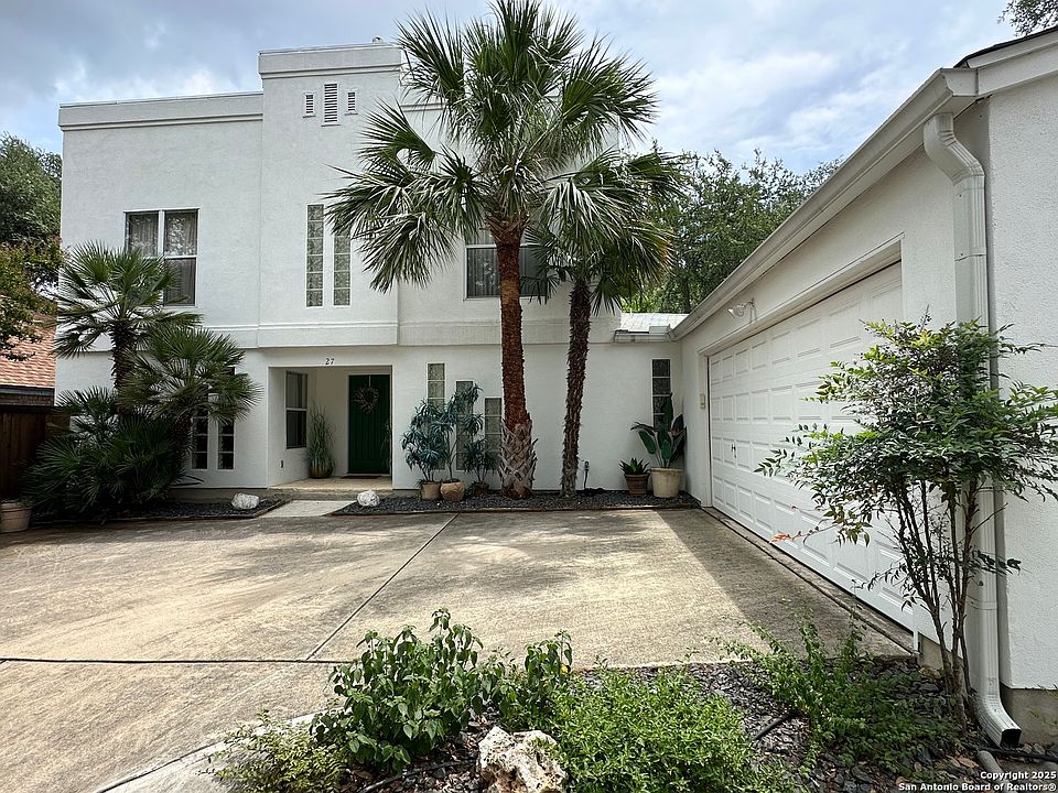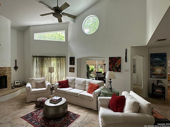 Art Deco meets Texas eclectic at this four-bedroom, two-story, all white house on a private street on San Antonio's northwest side. A unique feature of the custom home, built in 1998, is the West Texas sandstone floor that covers the first level. A fireplace anchors the living room which has a soaring ceiling and picture windows providing an abundance of light. The casual dining area adjoins the kitchen, which has space for a portable island. A formal dining room became a seamless addition to the house in 2011, with a large picture window overlooking the deck that covers the side-to-back yard. The primary bedroom features a large walk-in closet and a bathroom with a large shower. A second bedroom downstairs could be used as a study/office. Upstairs, a full bathroom with a tub/shower combo is situated between two same-size, carpeted bedrooms. The garage has space for two cars and some storage. Close to USAA, UTSA, the Medical Center and all the shops and entertainment venues around Loop 1604 and Interstate 10.