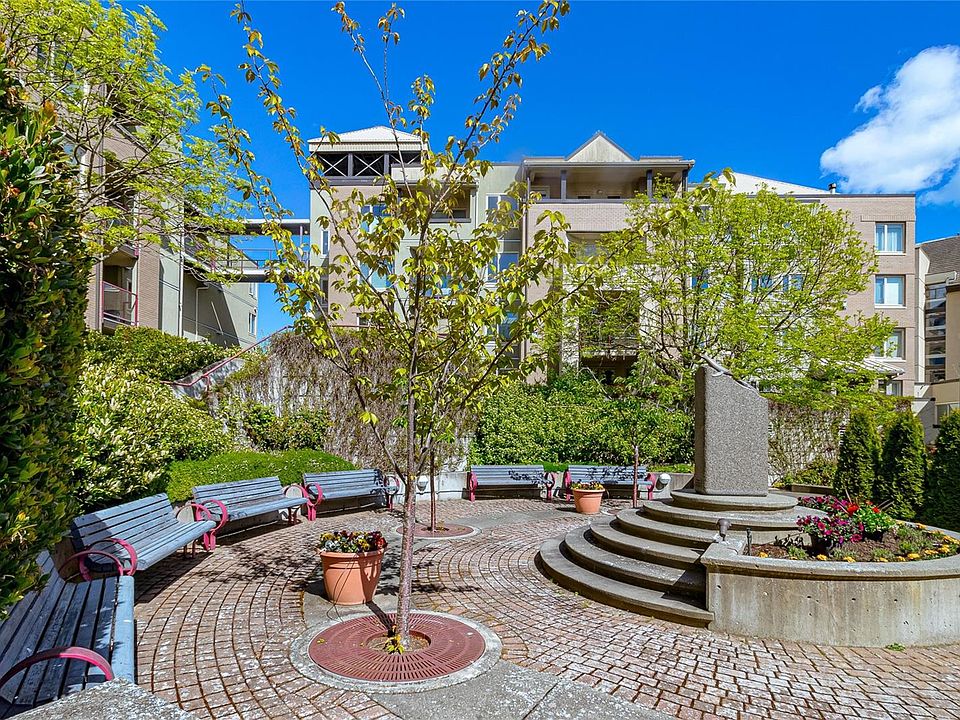 Nestled in the heart of the Inner Harbour, discover the epitome of urban living on a beautiful, quiet tree lined street. This spacious 2bed, 2bath home offers an unparalleled lifestyle. Enjoy the scenic Songhees Walkway, one of the most pleasant places in Victoria for a run or stroll, offering great views of the Inner Harbour, Strait of Juan de Fuca, and Victoria. This open concept home boasts a bright, renovated kitchen that shares a seamless layout with the living/dining area, feat: mixed use floors, a gas f/p, and private patio. The primary bedroom offers a large closet and full ensuite. Add features incl: secure underground pkg, storage, and strata fees covering both water and gas. With the exciting Roundhouse development approaching, this pet friendly, move in ready home is ideal for those seeking a dynamic waterfront lifestyle. Embrace the Inner Harbour lifestyle, with the Galloping Goose and dedicated cycling lanes nearby, and make this exceptional location your new home!