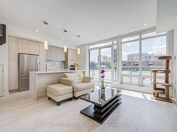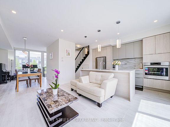This luxury 3-bedroom townhouse features 9-foot smooth ceilings throughout. Sunlight pours in through floor-to-ceiling windows showcasing park views. The open-concept kitchen impresses with custom cabinetry, stone slab countertops, and an oversized island. The ground-level suite offers heated floors. Enjoy direct garage access from the foyer. Premium condo amenities include a gym, sauna, game rooms, and rooftop barbecue area. The location can't be beat - walkable to the future Crosstown LRT and TTC hub. Surrounded by parks and shops, it's minutes from the DVP, 401, Science Centre, and Museum.