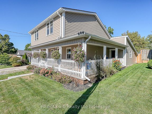 CHARM!!! This 1875 two storey century home features a covered wrap around front porch. The perfect spot for sipping a coffee or watching a storm. A large, private, backyard also offers great escape for relaxing or entertaining. Back deck with gazebo, well maintained gardens and yard, and a detached 1.5 car garage. Fully fenced and plenty of parking (5 vehicles). Windows and roof replaced within the last 7 years. Furnace 10 years. Hydro is 100 AMP breakers. Hot water heater is owned, and there are no rental items. This home has been lovingly maintained, hardwood, tile and pot lights on main floor. Large L shaped living room can double for various uses, open concept to dining room (large patio doors to backyard) and functional kitchen with ample cabinetry, island, granite countertops, and under cabinetry dimmable lighting. Laundry/storage and four-piece bathroom also on the main floor. Upstairs, there are three bedrooms (cable run to every room) and a three-piece bathroom. Basement is dry and great for additional storage. This home is ready for its next owner to enjoy throughout the years.
