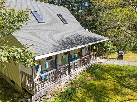 'New Drone Photos.' Beautiful stick-built home with wood interior in a private setting on Deer Isle. This home was designed and built in 2005. The large tree-filled lot has 5.76 acres of room for all your needs. There are two bedrooms and one full bath upstairs, a great room, and a lovely kitchen downstairs with a new refrigerator. Skylights and ceiling fans make cooling and heating this home energy efficient. This home has been used as a yearly rental, and the owner is retiring from the rental business.