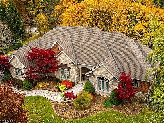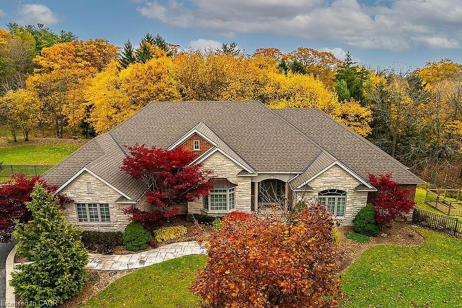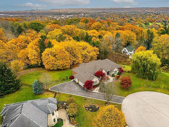 Luxury living at its finest! This custom-built bungalow Built by Neven Homes is on a quiet court at the top of Dundas Hill. The Stunning home offers over 2,713 sqft of main floor luxury living plus an additional lower level living space with walk-out , all on a premium landscaped 89.99 ft x 260.14 ft pie-shaped lot. Features soaring ceilings, gleaming hardwood floors, crown moldings, and expansive windows that flood the space with natural light and panoramic views. The open-concept living room, centered around a striking limestone fireplace, creates a warm and inviting space to relax or entertain. Entertainers look no further, host dinners in the spacious dining room or gather around the island in the gourmet kitchen with rich custom cabinetry, granite countertops and stainless steel appliances. Tucked just off the kitchen is a private den/home office, 2-piece bath, and spacious laundry room w/ access to the three car garage, with side-entry doors and street-facing windows for added curb appeal. The bedroom wing includes 3 bedrooms and 2 full baths, including a king-sized primary suite with a walk-in closet and spa-like ensuite featuring heated floors, whirlpool tub, shower, and water closet. The lower-level extents the space with high ceilings, a bright and spacious family room, 3-piece bath, lots of windows and double door walk-out, ideal for an in-law suite as there is existing rough-ins for another full bath and a kitchen in the unfinished area with a ton of potential. Meticulously maintained inside and out with completely updated roof shingles and a/c (2019). Enjoy your own park-like setting with mature pines and space for a future pool . Just minutes to downtown Dundas, shops, restaurants & amenities, Webster’s Falls, Dundas Golf & Country, schools, parks, trails and minutes to the QEW for commuters.