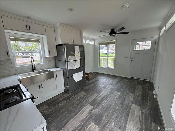 This custom-built tiny home features premium Hardy Smart Lap siding, modern white-trimmed windows, and a spacious 6-foot covered porch perfect for relaxing and enjoying lake breezes. Inside, the bright, open layout includes a white shaker kitchen with farmhouse sink, stainless steel appliances, thoughtful storage, a comfortable bedroom, and a full-size bath with stylish finishes.