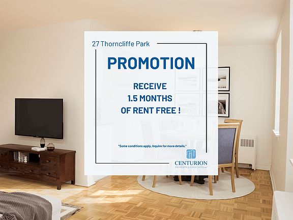 AboutThorncliffe Park Apartments are located at 27 Thorncliffe Park Drive in Toronto (East York), near the Thorncliffe Park Drive and Overlea Boulevard intersection just minutes away from the Don Valley Parkway. This building offers Studio, 1 bedroom apartment and 2 bedroom apartment options for rent with ample storage.