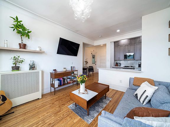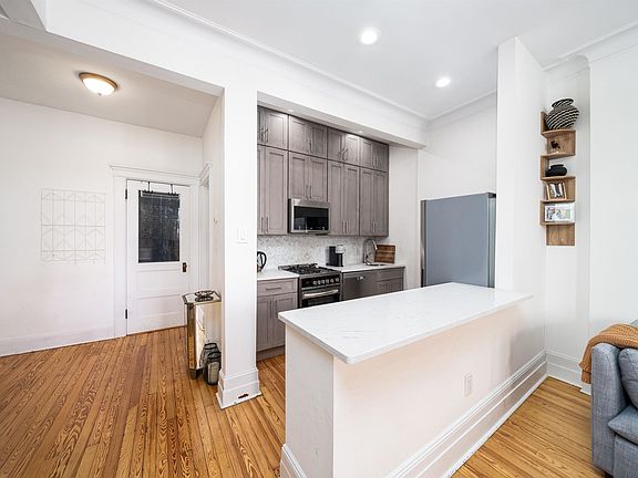 Sunny, top floor renovated one bedroom condo, centrally located in Jersey City Heights. This condo in a 5 unit row house combines modern finishes with classic period detail. The striking kitchen has Quartz countertops, marble herringbone backsplash, Haier stainless gas range, refrigerator, & microwave, KitchenAid dishwasher, eating nook and cabinetry galore. The spacious living room has a large bay window. Updated bathroom has subway tile and tub glass enclosure. High ceilings and refinished hardwood floors throughout. Heat and hot water included in the monthly maintenance. Common landscaped yard. Free laundry in basement and one large dedicated storage unit. Moments to restaurants, shops, parks and NYC/Hoboken/Jersey City transportation.