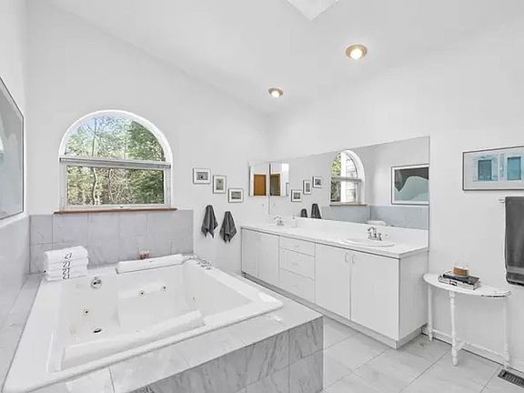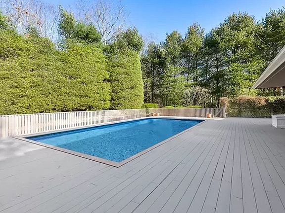 East Hampton White Pine Forest Sited on a generous acre-plus flag lot, located at the end of a cul-de-sac in a magical white pine forest deep in the Northwest Woods of East Hampton, this clean and well-maintained single-storey PostModern is the answer to that New Year's resolution that you made to yourself. Four bedrooms and three bathrooms in a thoughtful layout, with living-dining-kitchen connecting guest rooms with a sumptuous master suite. New roof, new air conditioning, new furnace, new oil tank, new stove, new barbecue. Nearly new are washer-dryer, water heater, dishwasher, and skylights. Your security is protected with an alarm system. Oversized property perimeter is lined by deer fencing and further fortified with an automatic driveway gate. The full-size swimming pool has elegant built-in steps across its width. It is surrounded by generous decking, which is further cocooned by blue hydrangeas and privacy landscaping. Sag Harbor Village and East Hampton Village