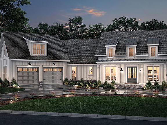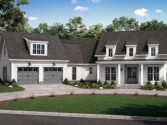 #51840HZ. This plan is shown and explained in Plan Details with optional features, i.e. pool and walkout patio, that are NOT currently included in the base price as listed.The price reflects the price of the home itself and does not include the property. You are responsible for providing the property on which these plans will be built.Architect's vision statement that includes options not currently priced: "This sophisticated modern farmhouse has iconic board and batten siding, three shed dormers above the front porch with open-tail rafters, and a shed dormer over the angled 2-car garage. Inside, an open floor plan has a great flow to it with the kitchen, dining, great room space with decorative beams and brick features - plus a vaulted ceiling (16'8" at its highest point) - are integrated into a space great for enjoying the company of others. The kitchen has an oversized walk-in pantry and a 4' by 9' island with great work space as well as casual seating on the great room side. The split bedroom layout maximizes your privacy and every bedroom has walk-in closets. The two family bedrooms share a Jack and Jill bath while the master suite has a five-fixture bath with dual vanities. Three large bedrooms with walk-in-closets - Separate office - Oversized kitchen with walk-in pantry - Front and rear porches for entertaining - Amazing master suite."
