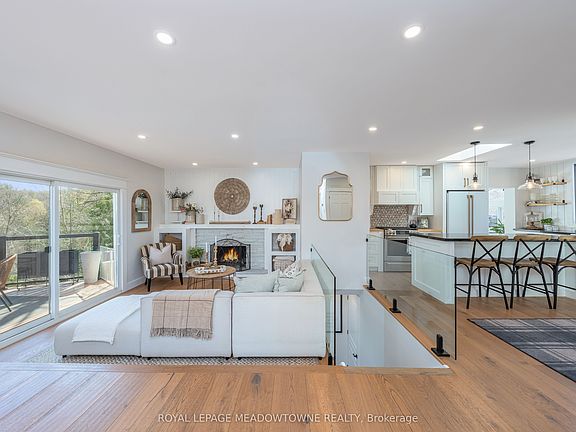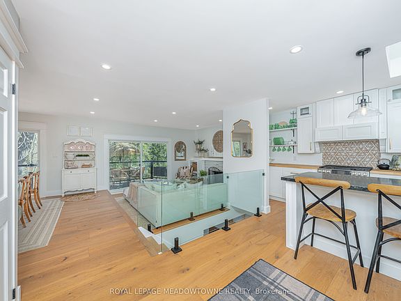 Welcome to this beautifully reimagined 4-bedroom home, privately nestled along a quiet gravel lane in the scenic village of Glen Williams. Set on nearly an acre with uninterrupted, year-round views of the Credit River, this property offers a rare fusion of peaceful nature and modern elegance. Step into the inviting sunroom -- bathed in natural light, its the perfect space to welcome guests, set up a creative home office, or simply relax with a good book. Inside, the main floor features stunning white oak floors and a breezy, open-concept layout that effortlessly connects the kitchen, dining, and living areas -- ideal for both everyday life and memorable entertaining. At the heart of the home, the chef-inspired kitchen combines functionality with elevated design. It boasts top-of-the-line Café appliances, ample cabinetry, and a striking picture window above the sink, framing views of the surrounding landscape. Upstairs, the serene primary suite offers a generous retreat, complete with a contemporary ensuite and space to unwind. Glass railings lead to the fully finished walkout basement, where abundant natural light and luxury vinyl plank flooring create a warm, open ambiance. This level includes a spacious family room, an additional bedroom and full bathroom, plus a versatile workshop area that could easily serve as a guest suite or creative studio. Outside, expansive decks provide a front-row seat to the river's beauty -- perfect for morning coffee, weekend lounging, or evenings under the stars. Offering the best of both worlds, this secluded escape is just seven minutes from the Georgetown GO Station, putting city access within easy reach while enjoying the charm and tranquility of Glen Williams.