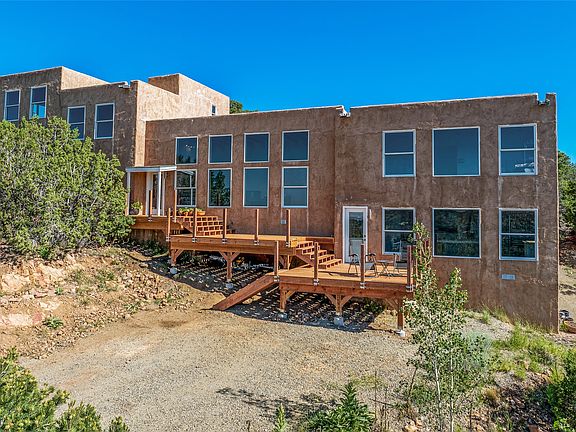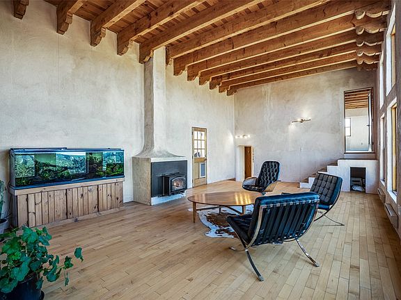New floors, new price and updated photos! All flooring is now in place. Sun-filled windows greet you from every room of this substantial home on six acres with expansive views, located in desirable Sunlit Hills. The great room, with 14’ high beamed ceilings and a central wood stove, anchors the home. The warm, wood-plank flooring adds to the appeal of this comfortable and sizable living area. The bright wood flooring throughout the house brings a modern feel to the home. Off the great room, there are two wings, one with newly renovated and inviting kitchen with concrete countertops, ample cabinets, commercial grade refrigerator/freezer and new appliances, with adjoining dining room, along with two additional rooms, currently utilized as studio space, allowing for many possible uses such as office, studio, media room, home gym, or an additional suite. The largest wing offers two suites with impressive views and updated bathrooms, including contemporary fixtures and marble tile. There is also a downstairs bedroom off the main room that currently serves as an office. All rooms in this home are of generous size. The home faces south and the passive solar design heats in winter. This is a great opportunity to own a substantial and versatile residence in a beautiful mountain setting 15 minutes from downtown Santa Fe. Easy access to I-25. A third bathroom is plumbed in the upper suite but not counted in the bathrooms here.