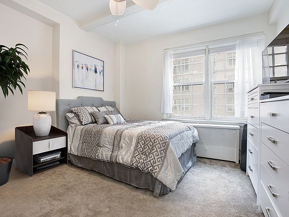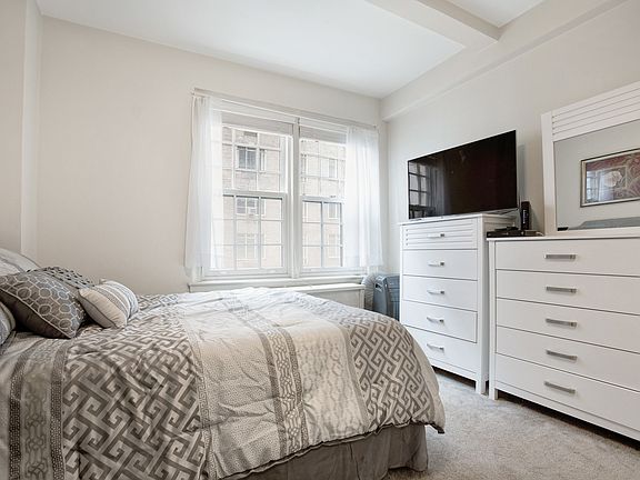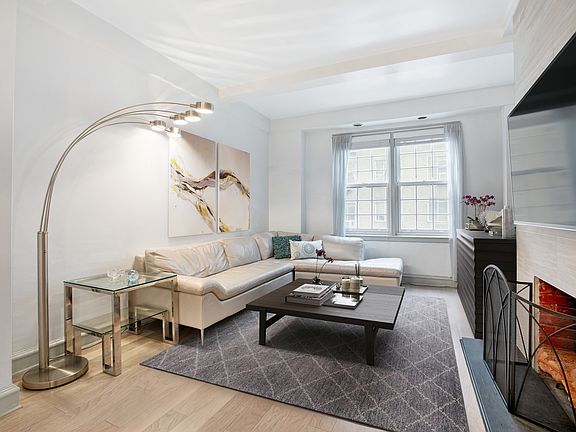 Beautifully renovated two bed, one bathroom co-op with upgraded electrical and plumbing is located in the perfect Midtown Central/Central Park South location. With extra-tall, 9'6" beamed ceilings, the bright home is illuminated by abundant windows facing south, east and west. In the great room with walnut hardwood floors throughout, a grand, wood-burning fireplace with porcelain tiles provides a warm focal point. The renovated, windowed kitchen with quartz countertops and full size appliances has plenty of cabinet storage for all of your needs. Two newly carpeted bedrooms, each with bright windows and large closets, conveniently flank the renovated bathroom equipped with porcelain tiles, custom made shower doors and vessel sink vanity. 27 West 55th Street is a prewar co-op with a charming lobby and just four apartments per floor. Residents of the pet-friendly 1923 building enjoy a live-in superintendent who collects packages, two elevators, laundry room, private storage bin and a bike room. Located in Midtown Central/Central Park South, this home is situated in the heart of Manhattan, surrounded on all sides by world-class dining, nightlife, shopping and entertainment. Michelin-starred eateries The Modern, Caviar Russe and Le Bernardin surround the home, and MoMA, Rockefeller Center, Carnegie Hall and Radio City Music Hall are all within blocks. Enjoy an afternoon at Bergdorf's, Bendel's or Barneys, or enjoy the delights of Central Park just three blocks away. Transportation from this central neighborhood is effortless with F/M, E, N/Q/R/W lines nearby and A/C, B/D and 1 trains at Columbus Circle.