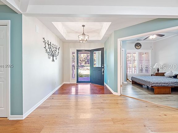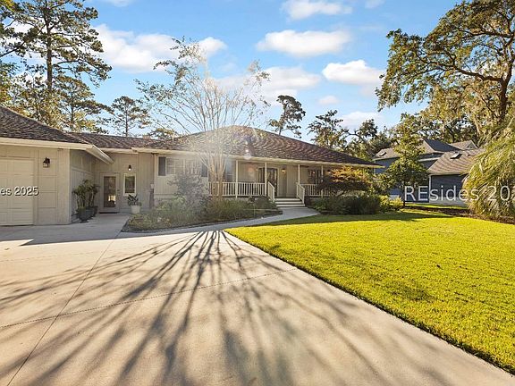 Discover this inviting Rose Hill charmer-a comfortable 3 BR, 2 BA Lowcountry home on a fenced 1/2 acre lot with pleasant golf course views. Tucked into a welcoming gated community, it offers easy indoor-outdoor living that's perfect for everyday enjoyment. A spacious front porch sets a friendly tone, leading into an open-concept layout that flows naturally. The living room features a vaulted cathedral ceiling with subtle nickel-gap paneling and a cozy gas fireplace, ideal for relaxing evenings. Adjacent, the eat-in kitchen features a floating hood, beadboard details, and tray ceilings. Plenty of counter space and cabinets make it easy to whip up meals for family or friends. The generous Primary Suite provides a peaceful retreat, complete with two walk-in closets and an en-suite bath boasting a large walk-in shower tiled floor-to-ceiling. Enjoy the whole house water filtration/softener system! At the back, a sunny Carolina room offers direct views of the outdoor space, blending the indoors with the fresh air. Outside, your private oasis shines: a 33-ft pool and Hot Springs hot tub sit within a screened lanai. The extra wide skirting around the pool gives room for lounge chairs, side tables, or whatever suits your style. Tucked behind the 2-car garage, find a handy storage shed and open-air patio, with easy kitchen access, for casual cookouts. The backyard wraps up with a separate concrete pad, ready for a firepit and seating to gather around as the sun sets. Rose Hill adds to the appeal with 24-hour manned gates for peace of mind. Residents enjoy 3 community pools, bocce courts, tennis and pickleball options, an onsite restaurant and bar, waterfront park, party house, and kayak/boat launch. Tennis and golf club memberships are available but not required. This well-maintained home is a great fit for those seeking a relaxed Lowcountry lifestyle!