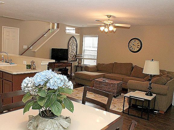 Nice Town House with Laminate dark wood floors in living area, carpet in bedrooms, window coverings, gas log fireplace, tile flooring in baths and kitchen/breakfast area, refrigerator, washer and dryer included. Full sprinkler system, extra-large back yard with plenty of room to socialized. Great Location! Close to Research Forest, shopping centers, hospitals, Community College & access to Park & Ride.
